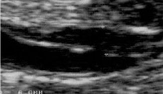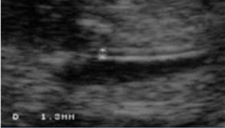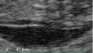 宝宝颈后透明带为2.9毫米,这个数值在正常范围的上限。虽然他的患病风险要高于左图1中的宝宝,但十有八九测量是完全正常的。