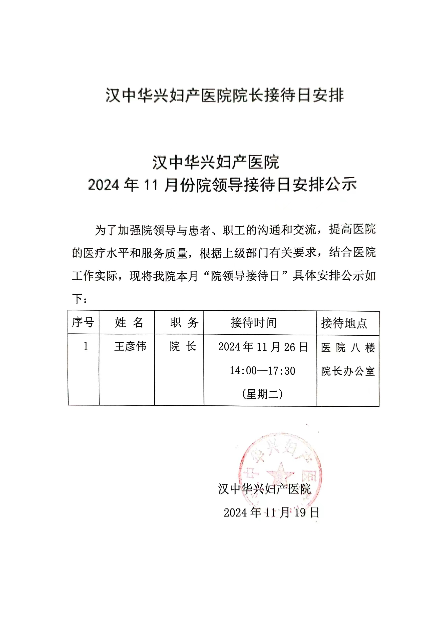 11月份“院领导接待日”安排公示