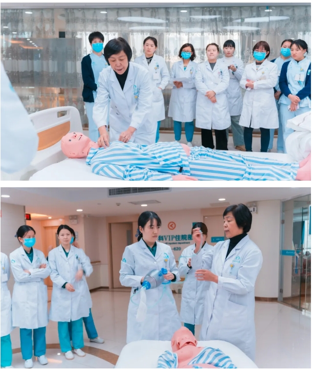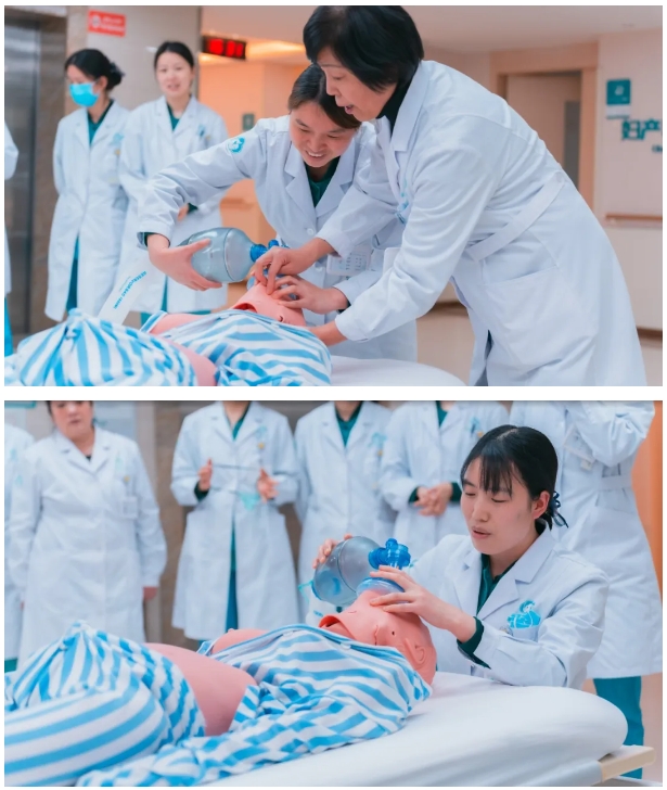 冯主任和护士长、护理骨干就心肺复苏术相关理论知识的讲解及示范培训,包括现场急救“黄金4分钟”的意义、如何判断患者有无意识、观察呼吸和脉搏、正确定位按压点、进行胸外按压和人工呼吸的方法、操作时按压深度、频率以及评估抢救效果等方面进行了操作流程示教,在冯主任的示教下,参训人员都积极加入到实操训练中,共同讨论、加强学习。