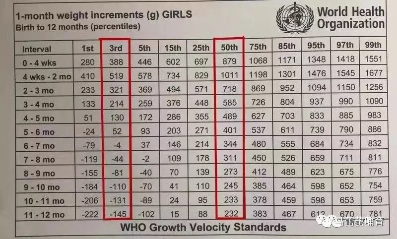 按照WHO的生长曲线标准,女宝宝要达到3%的生长曲线,第一个月只要长388g,第二个月只要长519g,第三个月只要长321g。