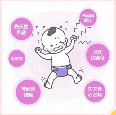 常见的出生缺陷包括先天性心脏病、唐氏综合征(21-三体综合征)、苯丙酮尿症、先天性耳聋、唇腭裂、神经管缺陷、无脑畸形、脊柱裂、脑积水等。